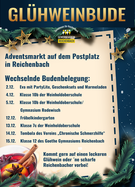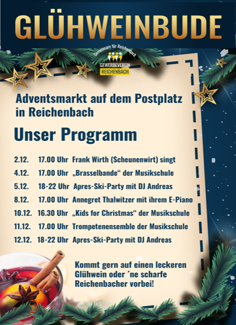 Der bereits 4. Reichenbacher Adventsmarkt beginnt am 4.12. auf dem Postplatz. Es wird natürlich wieder vieles angeboten, Glühwein, leckere Waffeln, täglich frisch gekochten Eintopf, Roster, Kaffee, Tee, Grog uvm. Da sollte für jeden Geschmack etwas dabei sein.